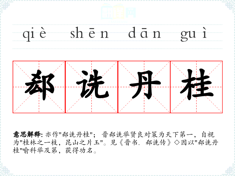 ,自视为"桂林之一枝,昆山之片玉"。见《晋书.郄诜传》◇因以"郄诜丹桂"喻科举及第,获得功名。