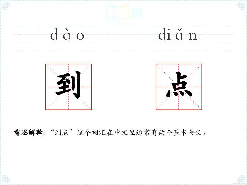 - 字面意思:指到达某个特定的时间点,如“会议到点了,我们开始吧。”