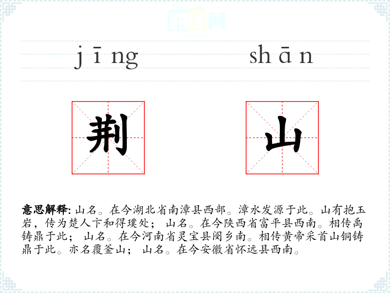 1.山名。在今湖北省南漳县西部。漳水发源于此。山有抱玉岩,传为楚人卞和得璞处; 山名。在今陕西省富平县西南。相传禹铸鼎于此; 山名。在今河南省灵宝县阌乡南。相传黄帝采首山铜铸鼎于此。亦名覆釜山; 山名。在今安徽省怀远县西南。