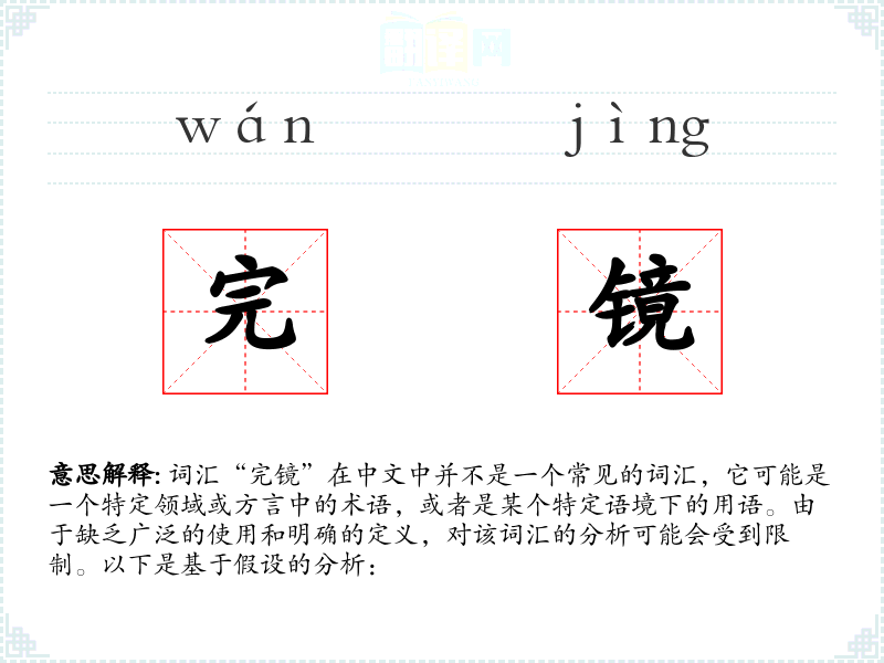 - 字面意思:结合“完”和“镜”两个字,可能指的是“完整的镜子”或“镜子完成的状态”。