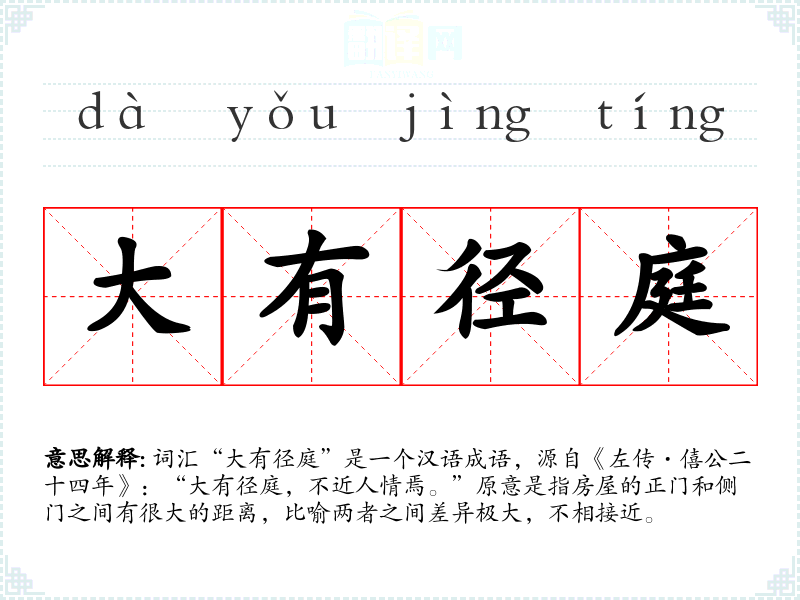 词汇“大有径庭”是一个汉语成语,源自《左传·僖公二十四年》:“大有径庭,不近人情焉。”原意是指房屋的正门和侧门之间有很大的距离,比喻两者之间差异极大,不相接近。