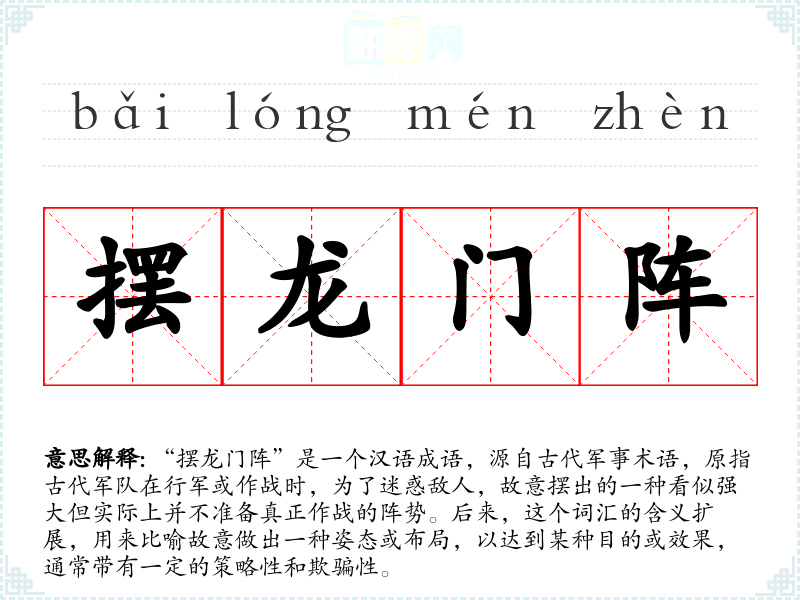 “摆龙门阵”是一个汉语成语,源自古代军事术语,原指古代军队在行军或作战时,为了迷惑敌人,故意摆出的一种看似强大但实际上并不准备真正作战的阵势。后来,这个词汇的含义扩展,用来比喻故意做出一种姿态或布局,以达到某种目的或效果,通常带有一定的策略性和欺骗性。