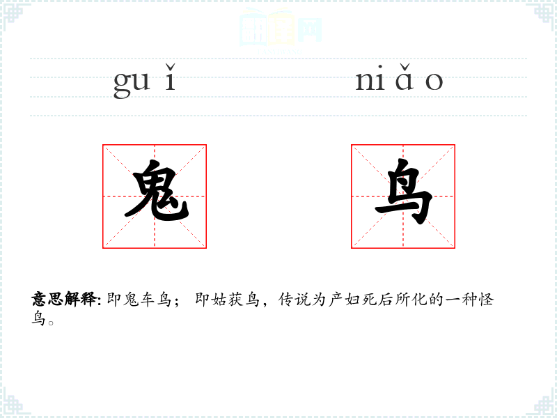 即鬼车鸟; 即姑获鸟,传说为产妇死后所化的一种怪鸟。