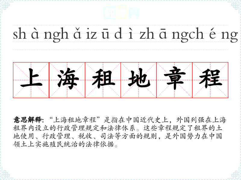 “上海租地章程”这一词汇源于近代史,特别是鸦片战争后,外国列强在上海设立租界并制定相应的管理规定。随着时间的推移,这一词汇逐渐成为研究近代史和国际关系的重要学术术语。