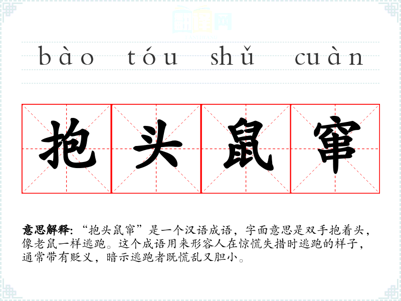 “抱头鼠窜”是一个汉语成语,字面意思是双手抱着头,像老鼠一样逃跑。这个成语用来形容人在惊慌失措时逃跑的样子,通常带有贬义,暗示逃跑者既慌乱又胆小。