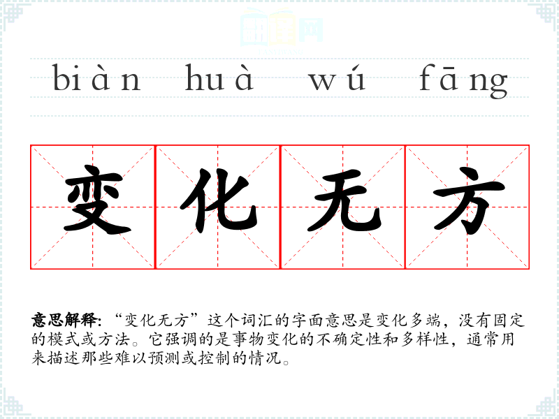 在英语中,“变化无方”可以对应为“ever-changing”或“unpredictable”。这些词汇在英语中也用来描述那些不断变化且难以预测的情况。