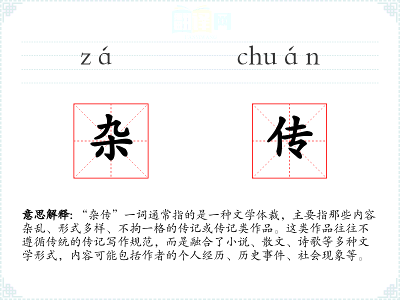 “杂传”一词通常指的是一种文学体裁,主要指那些内容杂乱、形式多样、不拘一格的传记或传记类作品。这类作品往往不遵循传统的传记写作规范,而是融合了小说、散文、诗歌等多种文学形式,内容可能包括作者的个人经历、历史**、社会现象等。