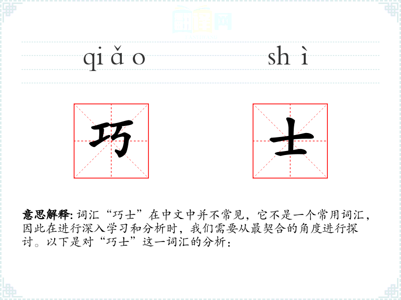 “巧士”字面意思是指技艺高超、机智灵活的人。其中,“巧”表示巧妙、精巧,“士”通常指有学识或有技能的人。