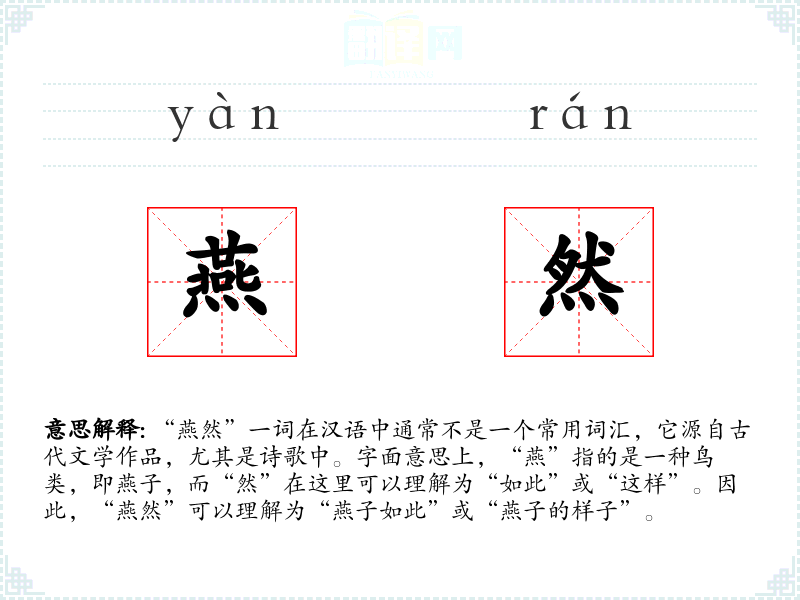 “燕然”一词在汉语中通常不是一个常用词汇,它源自古代文学作品,尤其是诗歌中。字面意思上,“燕”指的是一种鸟类,即燕子,而“然”在这里可以理解为“如此”或“这样”。因此,“燕然”可以理解为“燕子如此”或“燕子的样子”。