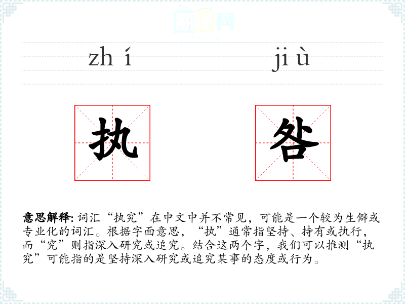 词汇“执究”在中文中并不常见,可能是一个较为生僻或专业化的词汇。根据字面意思,“执”通常指坚持、持有或执行,而“究”则指深入研究或追究。结合这两个字,我们可以推测“执究”可能指的是坚持深入研究或追究某事的态度或行为。
