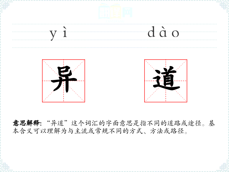 “异道”由“异”和“道”两个字组成。“异”字古汉语中意为不同或异常,“道”字则指道路或方法。在古代文献中,“异道”常用来描述非传统的思想或行为方式。