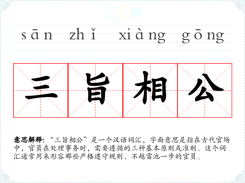 “三旨相公”是一个汉语词汇,字面意思是指在古代官场中,官员在处理事务时,需要遵循的三种基本原则或准则。这个词汇通常用来形容那些严格遵守规则、不越雷池一步的官员。
