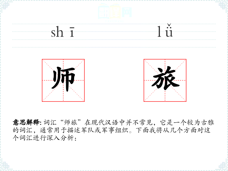 词汇“师旅”在现代汉语中并不常见,它是一个较为古雅的词汇,通常用于描述军队或军事组织。下面我将从几个方面对这个词汇进行深入分析:
