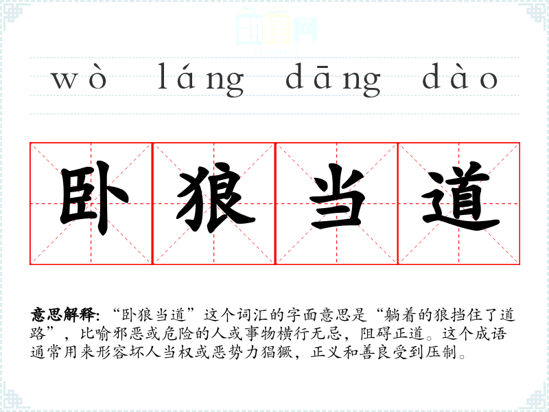 “卧狼当道”这个词汇的字面意思是“躺着的狼挡住了道路”,比喻邪恶或危险的人或事物横行无忌,阻碍正道。这个成语通常用来形容坏人当权或恶势力猖獗,正义和善良受到压制。