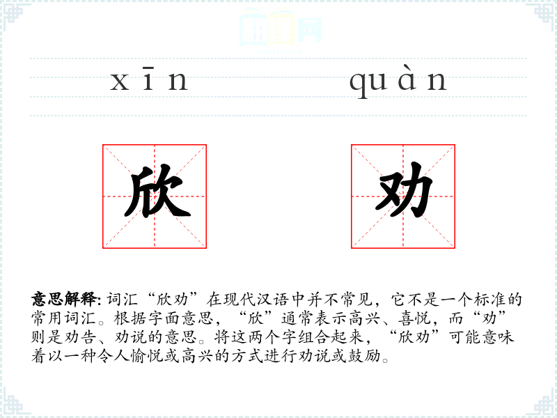 由于“欣劝”不是一个常用词汇,其词源和历史演变不详。它可能是由“欣”和“劝”两个常用词汇组合而成的新词。
