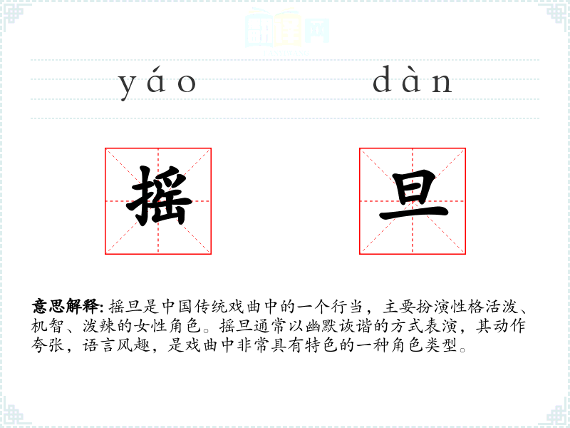 摇旦一词源自**传统戏曲,其名称可能来源于角色表演时的动作特点,即动作摇摆、活泼。随着戏曲艺术的发展,摇旦的角色类型和表演风格也在不断演变和丰富。