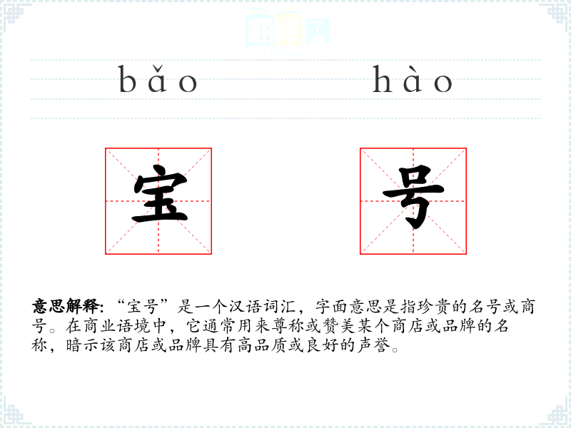 “宝号”是一个汉语词汇,字面意思是指珍贵的名号或商号。在商业语境中,它通常用来尊称或赞美某个商店或品牌的名称,暗示该商店或品牌具有高品质或良好的声誉。