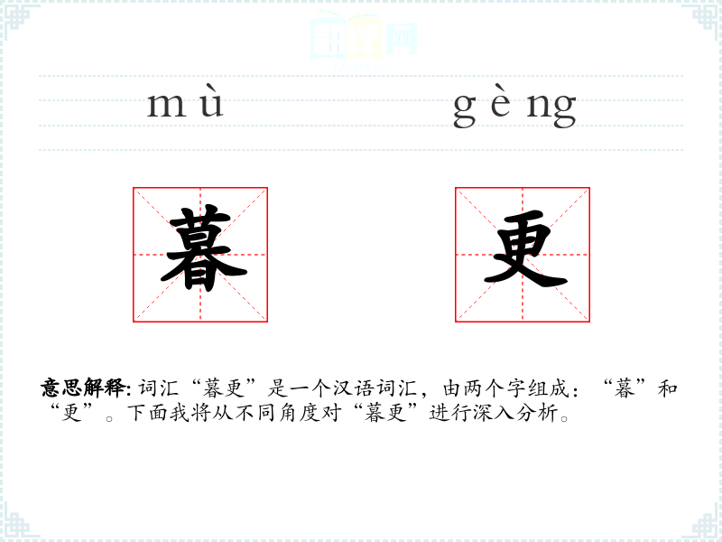 - 字面意思:“暮”通常指傍晚或日落时分,表示一天的结束;“更”在古代指夜间的时间单位,一夜分为五更,每更约两小时。