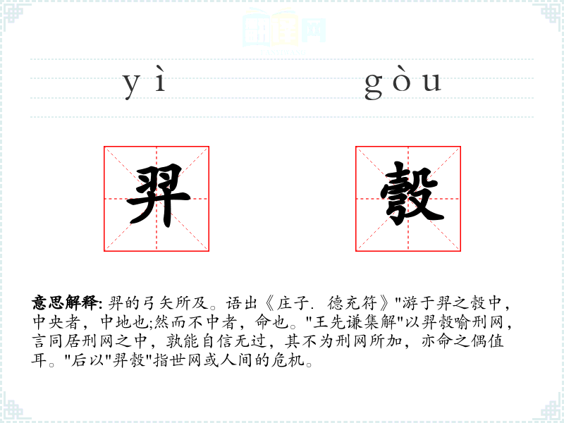1.羿的弓矢所及。语出《庄子.德充符》"游于羿之彀中,中央者,中地也;然而不中者,命也。"王先谦集解"以羿彀喻刑网,言同居刑网之中,孰能自信无过,其不为刑网所加,亦命之偶值耳。"后以"羿彀"指世网或人间的危机。