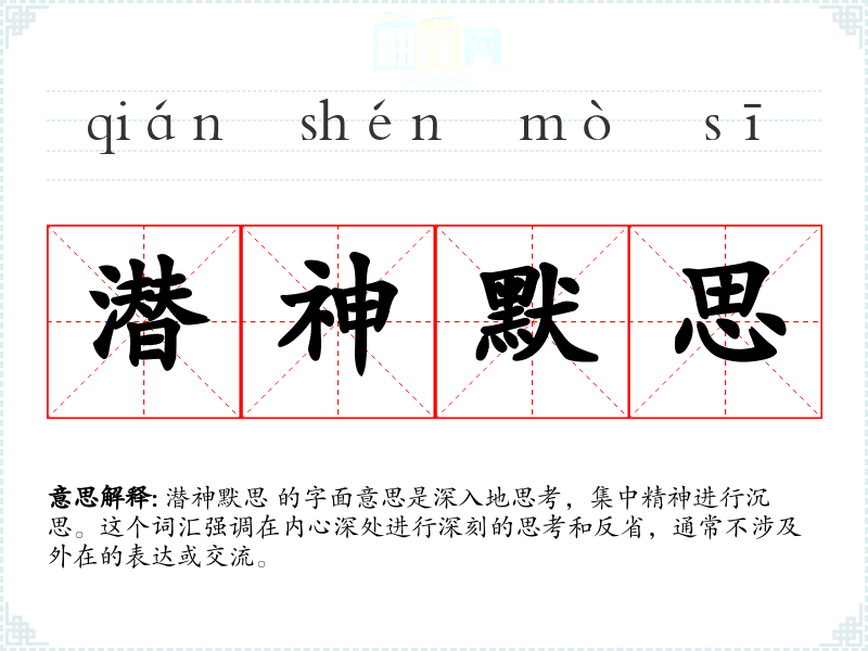 潜神默思 的字面意思是深入地思考,集中精神进行沉思。这个词汇强调在内心深处进行深刻的思考和反省,通常不涉及外在的表达或交流。