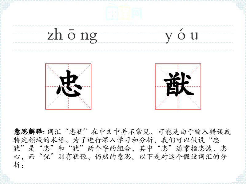 词汇“忠犹”在中文中并不常见,可能是由于输入错误或特定领域的术语。为了进行深入学*和分析,我们可以假设“忠犹”是“忠”和“犹”两个字的组合,其中“忠”通常指忠诚、忠心,而“犹”则有犹豫、仍然的意思。以下是对这个假设词汇的分析: