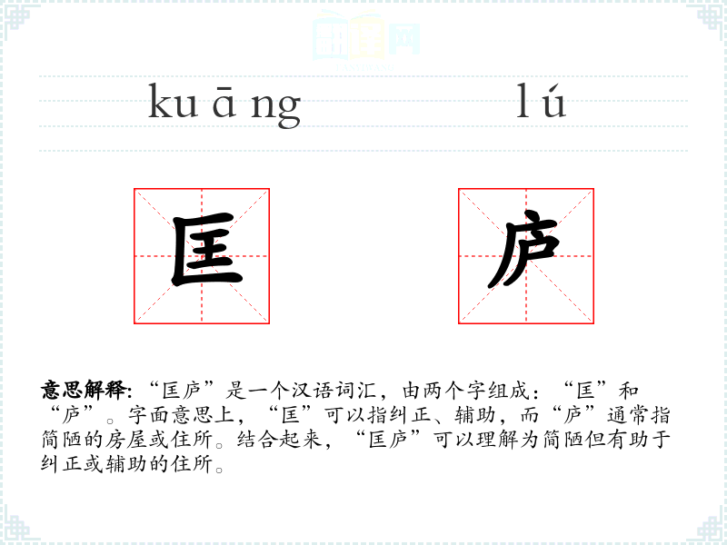 “匡庐”是一个汉语词汇,由两个字组成:“匡”和“庐”。字面意思上,“匡”可以指纠正、辅助,而“庐”通常指简陋的房屋或住所。结合起来,“匡庐”可以理解为简陋但有助于纠正或辅助的住所。