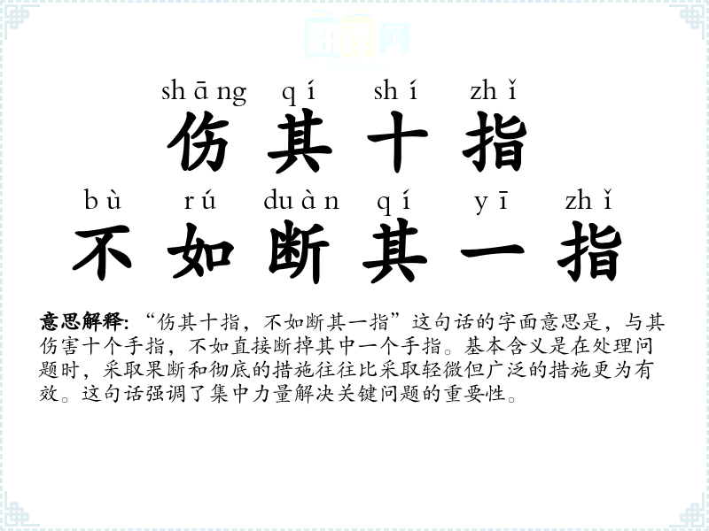 “伤其十指,不如断其一指”这句话的字面意思是,与其伤害十个手指,不如直接断掉其中一个手指。基本含义是在处理问题时,采取果断和彻底的措施往往比采取轻微但广泛的措施更为有效。这句话强调了集中力量解决关键问题的重要性。
