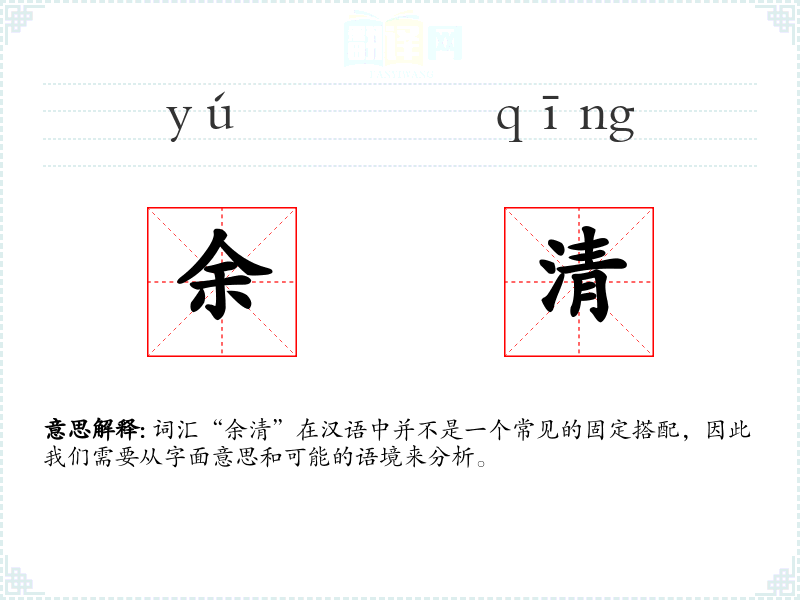 词汇“余清”在汉语中并不是一个常见的固定搭配,因此我们需要从字面意思和可能的语境来分析。