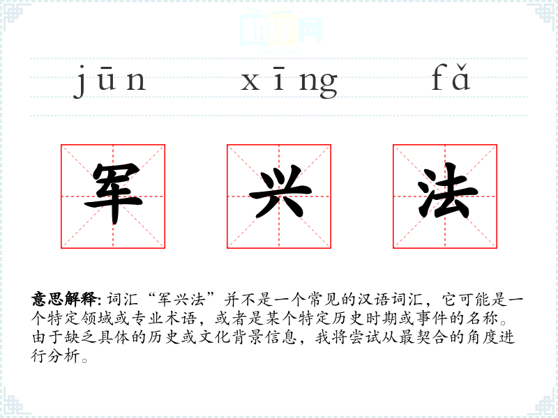 由于“军兴法”不是一个广为人知的词汇,它在不同语境下的使用可能非常有限。在专业领域,如军事法学、历史研究或特定国家的法律体系中,可能会有更具体的定义和应用。