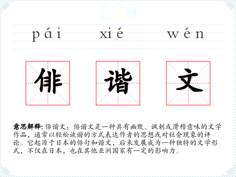 俳谐文:俳谐文是一种具有幽默、讽刺或滑稽意味的文学作品,通常以轻松诙谐的方式表达作者的思想或对社会现象的评论。它起源于日本的俳句和谐文,后来发展成为一种独特的文学形式,不仅在日本,也在其他亚洲国家有一定的影响力。