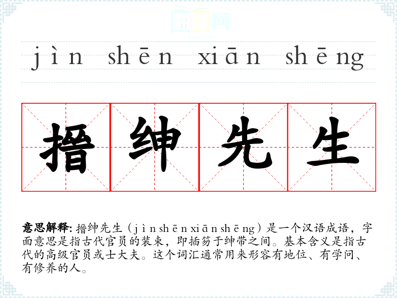 搢绅先生(jìn shēn xiān shēng)是一个汉语成语,字面意思是指古代官员的装束,即插笏于绅带之间。基本含义是指古代的高级官员或士大夫。这个词汇通常用来形容有地位、有学问、有修养的人。