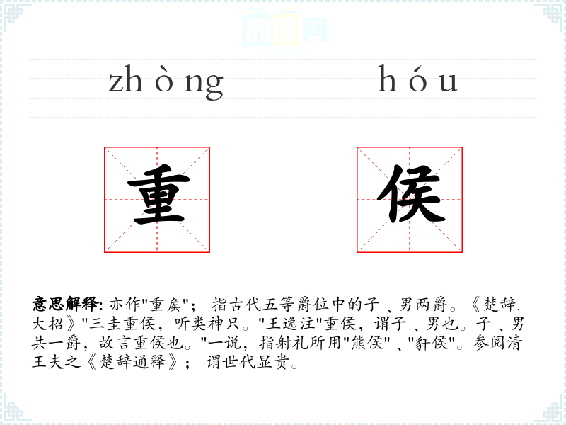 亦作"重矦"; 指古代五等爵位中的子﹑男两爵。《楚辞.大招》"三圭重侯,听类神只。"王逸注"重侯,谓子﹑男也。子﹑男共一爵,故言重侯也。"一说,指射礼所用"熊侯"﹑"豻侯"。参阅清王夫之《楚辞通释》; 谓世代显贵。