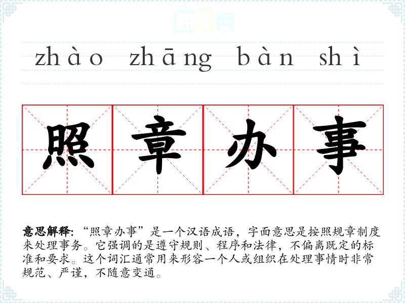 “照章办事”是一个汉语成语,字面意思是按照规章制度来处理事务。它强调的是遵守规则、程序和法律,不偏离既定的标准和要求。这个词汇通常用来形容一个人或组织在处理事情时非常规范、严谨,不随意变通。