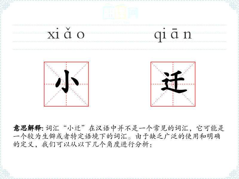 词汇“小迁”在汉语中并不是一个常见的词汇,它可能是一个较为生僻或者特定语境下的词汇。由于缺乏广泛的使用和明确的定义,我们可以从以下几个角度进行分析: