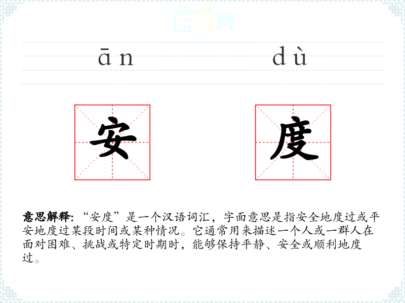 “安度”这个词在汉语中承载了丰富的情感和文化内涵,它不仅仅是一个简单的度过某段时间的表达,更是一种对平和、安全的向往和祝愿。在学*语言和表达时,理解和运用这样的词汇能够丰富我们的语言表达,增强沟通的深度和广度。