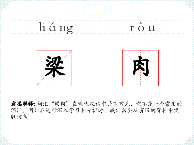 词汇“梁肉”在现代汉语中并不常见,它不是一个常用的词汇,因此在进行深入学*和分析时,我们需要从有限的资料中提取信息。