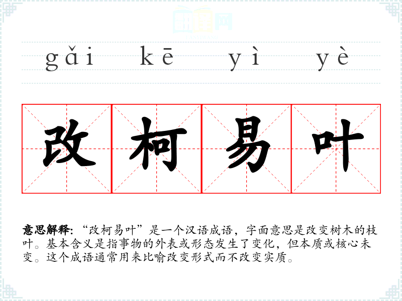 “改柯易叶”是一个汉语成语,字面意思是改变树木的枝叶。基本含义是指事物的外表或形态发生了变化,但本质或核心未变。这个成语通常用来比喻改变形式而不改变实质。