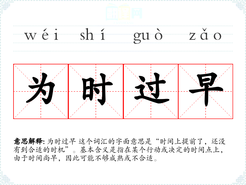 为时过早 这个词汇的字面意思是“时间上提前了,还没有到合适的时机”。基本含义是指在某个行动或决定的时间点上,由于时间尚早,因此可能不够成熟或不合适。