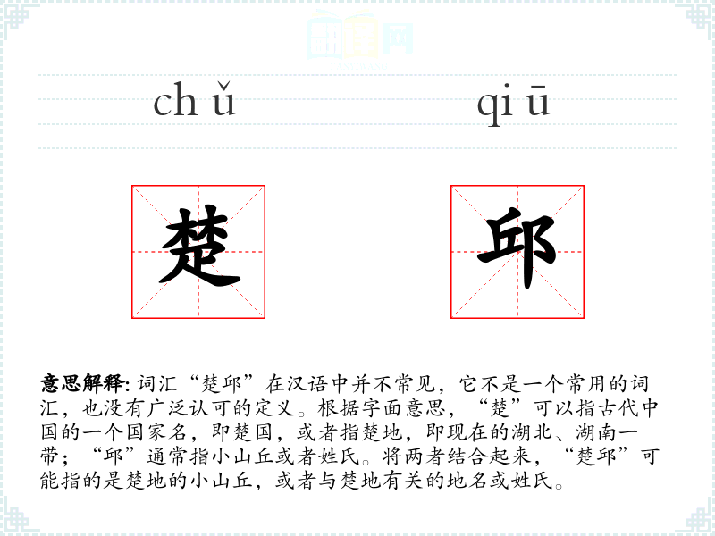 同义词方面,如果“楚邱”指的是楚地的小山丘,那么同义词可能包括“楚山”、“楚丘”等。反义词则难以确定,因为这个词汇的使用非常有限。