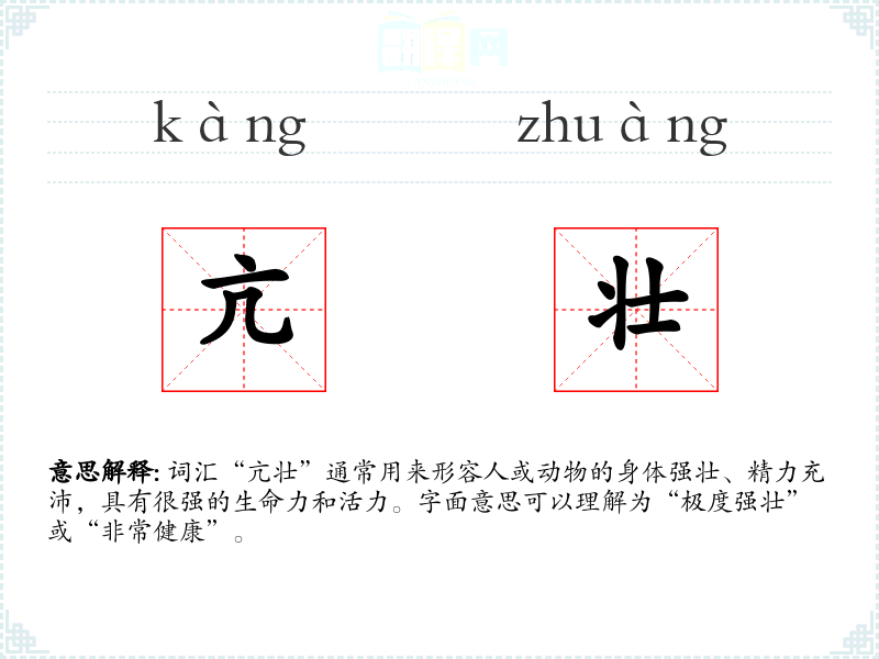 词汇“亢壮”通常用来形容人或动物的身体强壮、精力充沛,具有很强的生命力和活力。字面意思可以理解为“极度强壮”或“非常健康”。