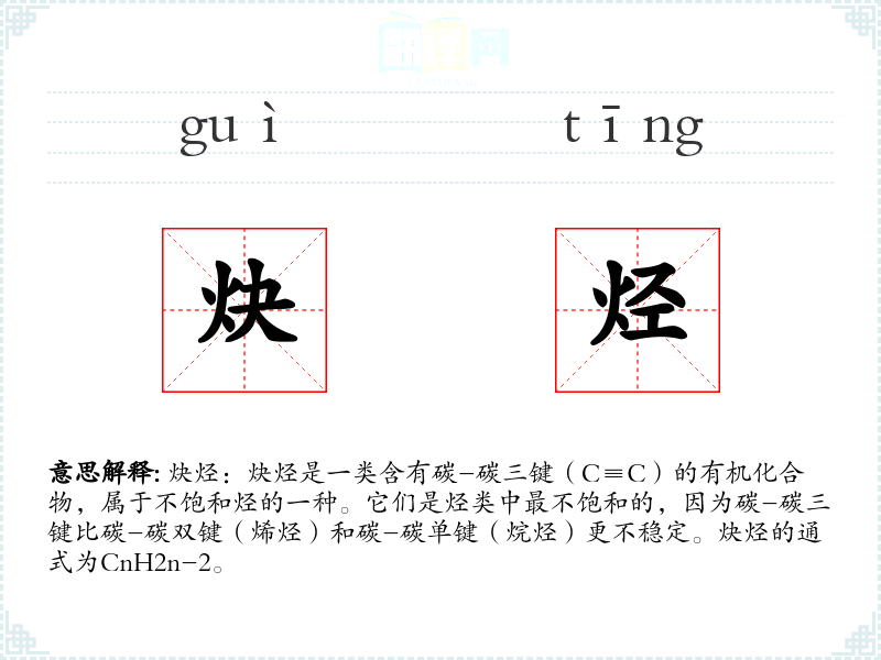 "炔烃"的意思解释、炔烃是什么意思由翻译网汉语词典查词提供。