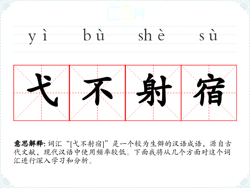 词汇“[弋不射宿]”是一个较为生僻的汉语成语,源自古代文献,现代汉语中使用频率较低。下面我将从几个方面对这个词汇进行深入学*和分析。