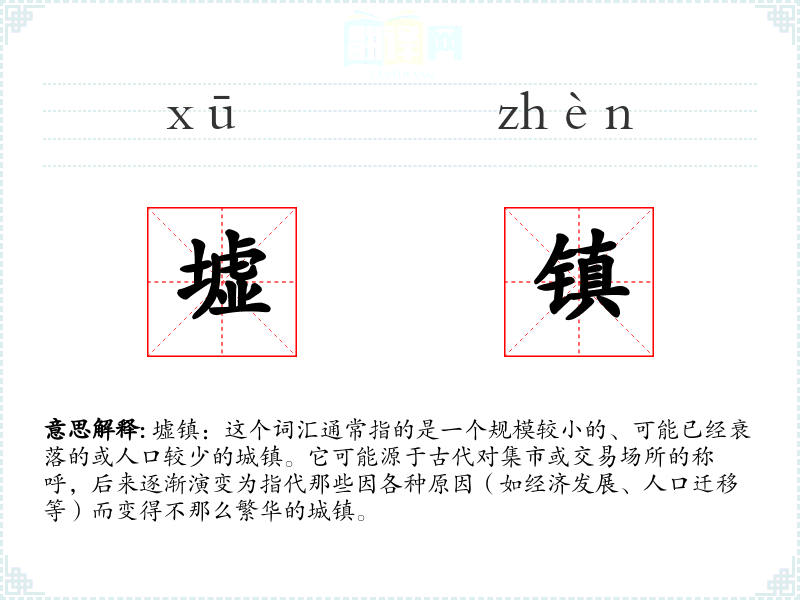 墟镇:这个词汇通常指的是一个规模较小的、可能已经衰落的或人口较少的城镇。它可能源于古代对集市或交易场所的称呼,后来逐渐演变为指代那些因各种原因(如经济发展、人口迁移等)而变得不那么繁华的城镇。