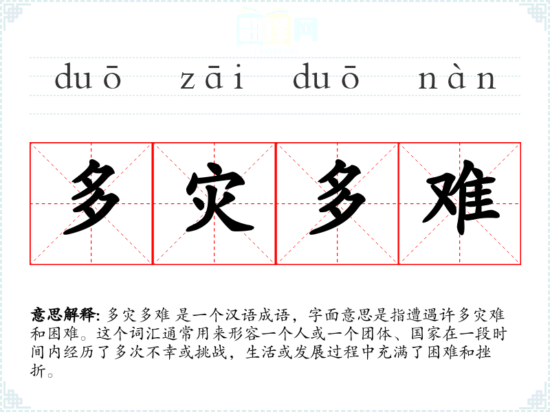 多灾多难 是一个汉语成语,字面意思是指遭遇许多灾难和困难。这个词汇通常用来形容一个人或一个团体、国家在一段时间内经历了多次不幸或挑战,生活或发展过程中充满了困难和挫折。