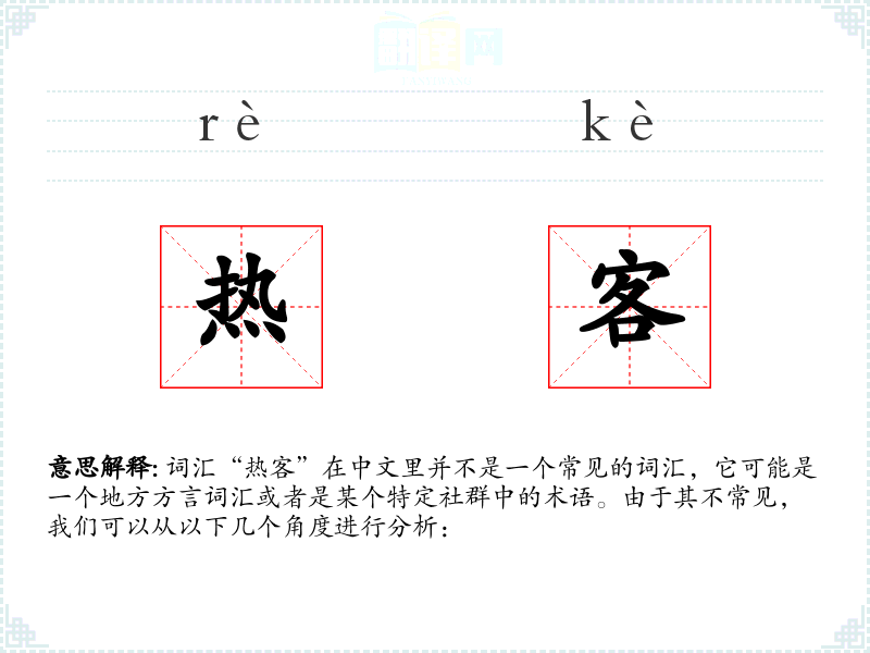 词汇“热客”在中文里并不是一个常见的词汇,它可能是一个地方方言词汇或者是某个特定社群中的术语。由于其不常见,我们可以从以下几个角度进行分析: