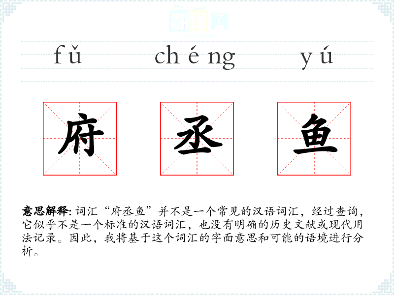 词汇“府丞鱼”并不是一个常见的汉语词汇,经过查询,它似乎不是一个标准的汉语词汇,也没有明确的历史文献或现代用法记录。因此,我将基于这个词汇的字面意思和可能的语境进行分析。