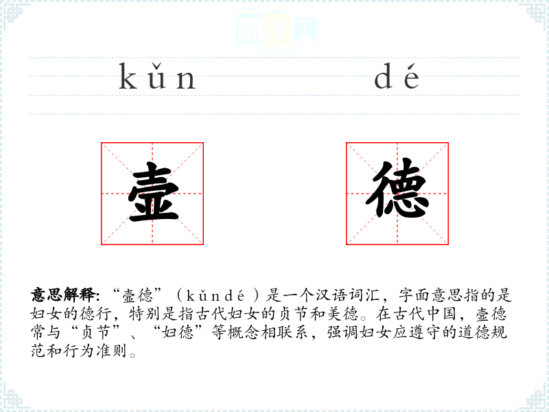 “壸德”(kǔn dé)是一个汉语词汇,字面意思指的是妇女的德行,特别是指古代妇女的贞节和美德。在古代**,壸德常与“贞节”、“妇德”等概念相联系,强调妇女应遵守的道德规范和行为准则。