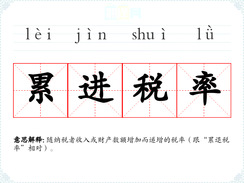 随纳税者收入或财产数额增加而递增的税率(跟“累退税率”相对)。