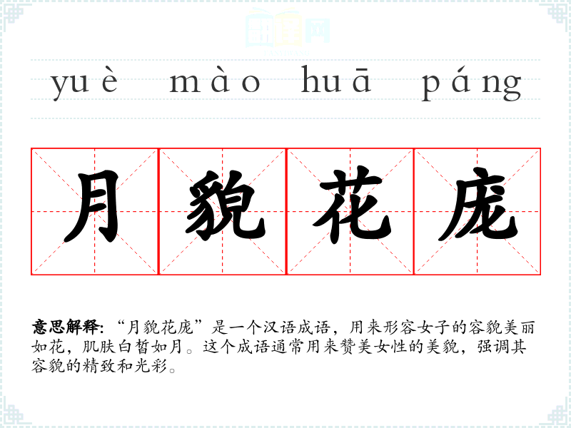 “月貌花庞”是一个汉语成语,用来形容女子的容貌美丽如花,肌肤白皙如月。这个成语通常用来赞美女性的美貌,强调其容貌的精致和光彩。