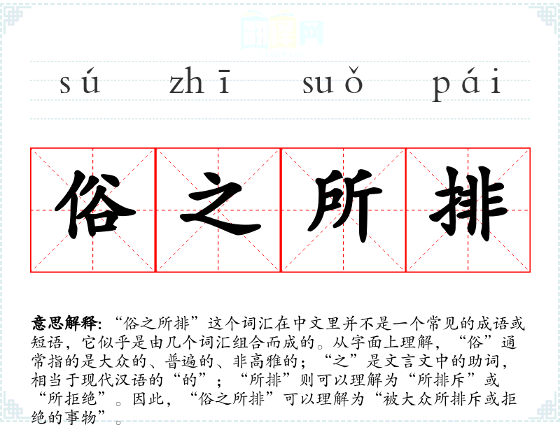 由于“俗之所排”不是一个标准的成语或短语,它的词源和演变不太明确。它可能是现代汉语中由几个词汇组合而成的一个表达方式,用以描述某种社会现象或文化态度。